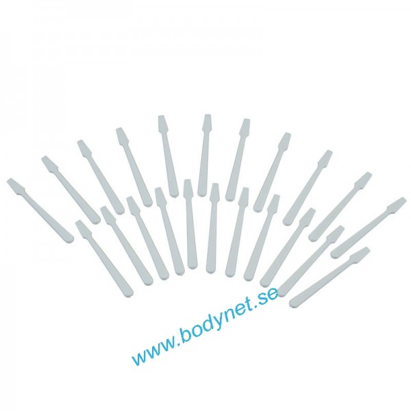 Innehåller 25 st. spatlar för användning till hudkrämer. Istället för att använda fingrarna används spateln för att inte bakterier och smuts skall komma ner i krämerna. Det är hygieniskt och krämerna håller sig fräscha även efter t.ex många demonstrationer.